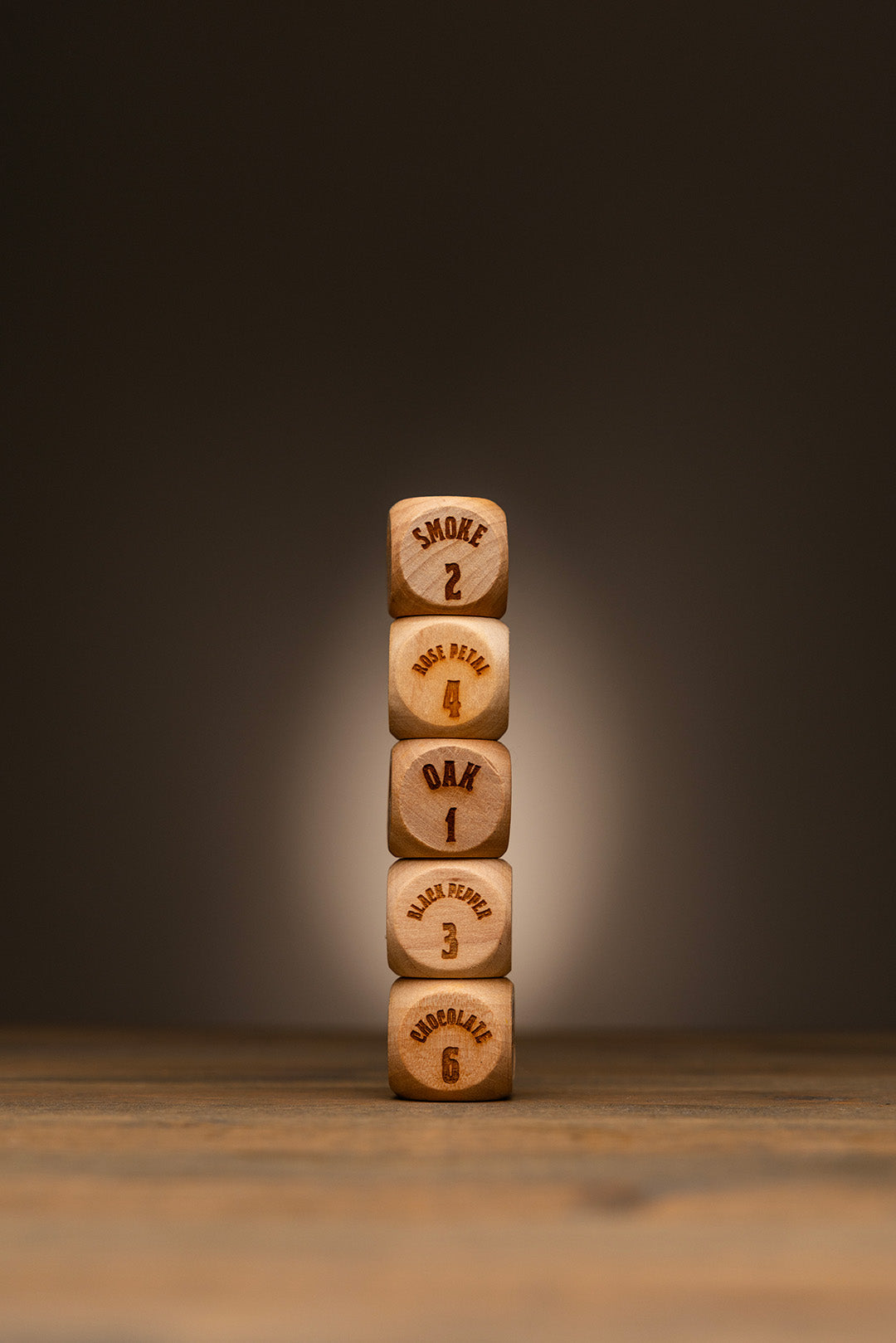 This original set features 5 beautiful custom-made wooden dice, each with six different bourbon tasting notes etched into the wood (for a total of 30 notes).
